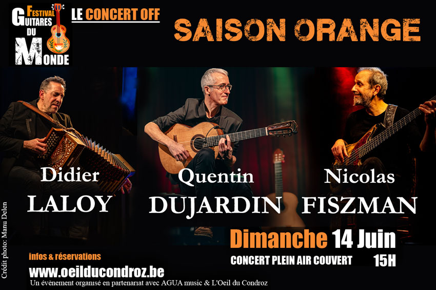 L'Oeil du Condroz organise le dimanche 14 juin à 15h le concert OFF du Festival Guitares du Monde 2026. Un concert exceptionnel à ne pas manquer sous la tente berbère avec Quentin Dujardin, Didier Laloy & Nicolas Fiszman.